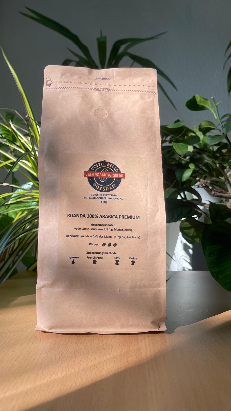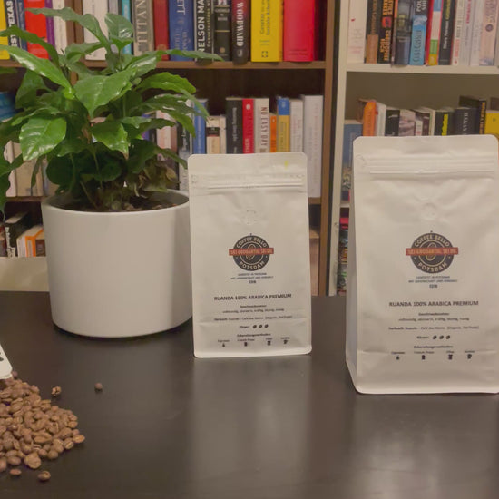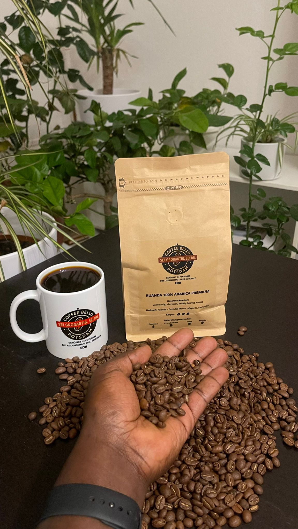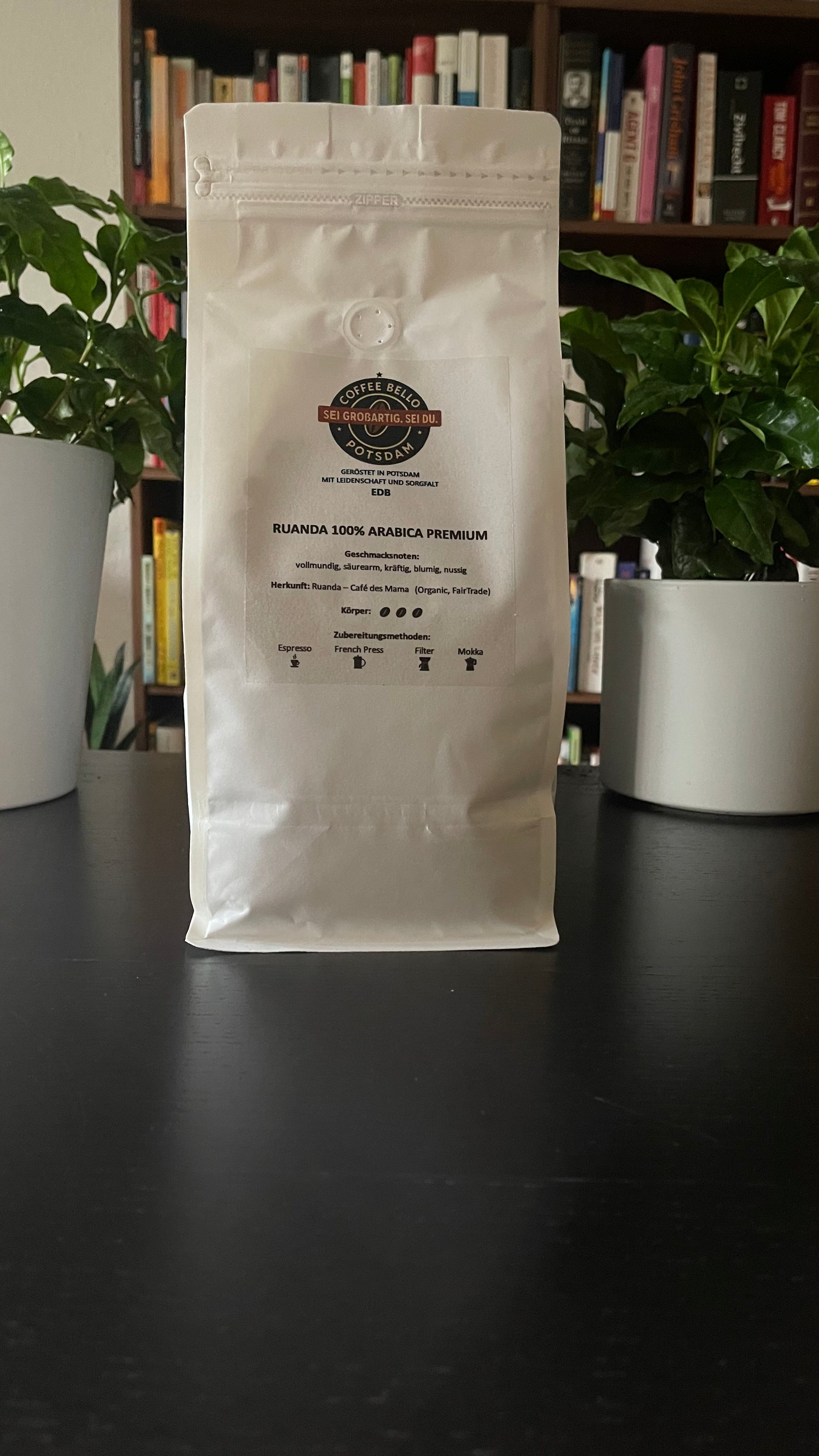 Our Ruanda 100% Arabica Premium is a full-bodied specialty coffee grown in the fertile highlands of Rwanda and sourced directly from Café des Mama (Organic, FairTrade). Hand-selected 100% Arabica beans guarantee top quality and authentic flavor. Each batch is roasted in Potsdam with passion and care by our roasting master Mathias, who brings more than 30 years of roasting experience.